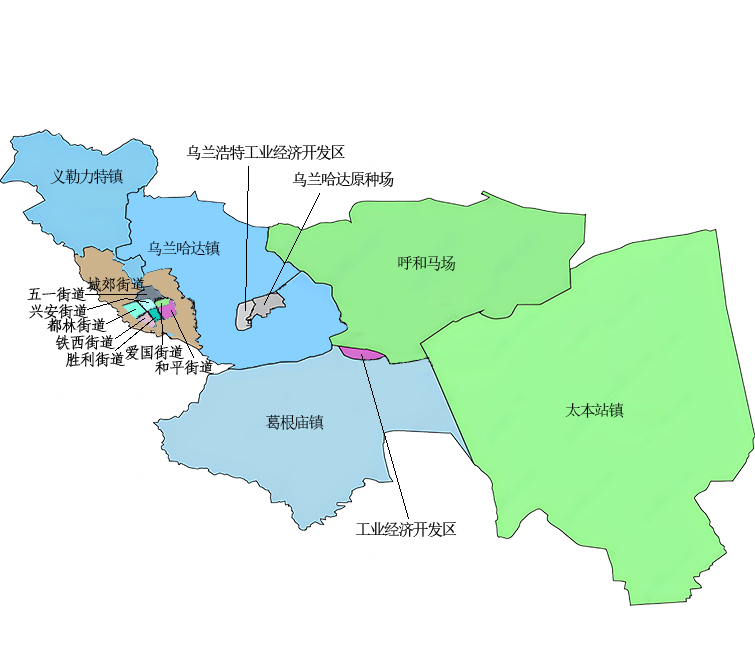 乌兰浩特市位于内蒙古自治区东北部,兴安盟东南部,东与扎赉特旗、吉林省镇赉县毗邻,南与吉林省白城市洮北区、洮南市接壤,西南与吉林省洮南市相连,西、北与科尔沁右翼前旗相邻。地处大兴安岭山脉的中段与松辽平原过渡地带,属低山丘陵地貌。总面积2353.5平方千米。境内矿产资源主要有萤石、石灰石、建筑用沙石、砂质黏土;建筑用岩石分布广泛。乌兰浩特市林业用地68113公顷,森林覆盖率26.6%,活立木蓄积824534立方米,用材林面积13639公顷。全市林木蓄积量586736立方米,占活立木总蓄积量的71.2%。辖4个建制镇,11个街道办事处,39个嘎查,19个村,59个社区居民委员会(不包括呼和马场、公主陵牧?。?023年,地区生产总值2232803.0万元,按可比价计算,同比增长6%。其中,第一产业154701.0万元,同比增长5.7%;第二产业1008435.0万元,同比增长4.1%;第三产业1069667.0万元,同比增长7.6%。